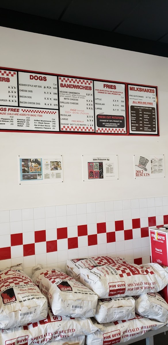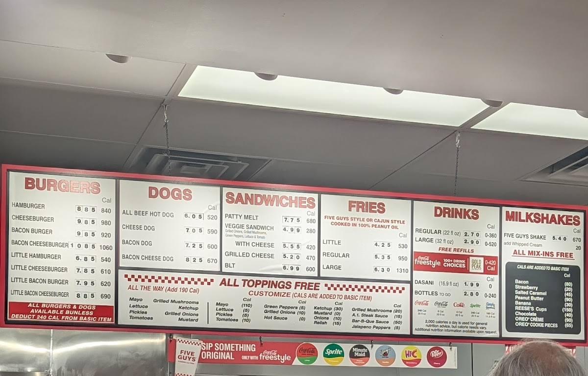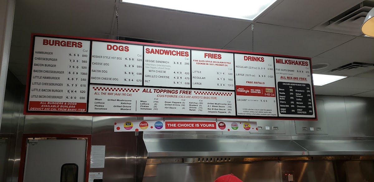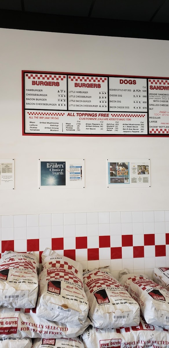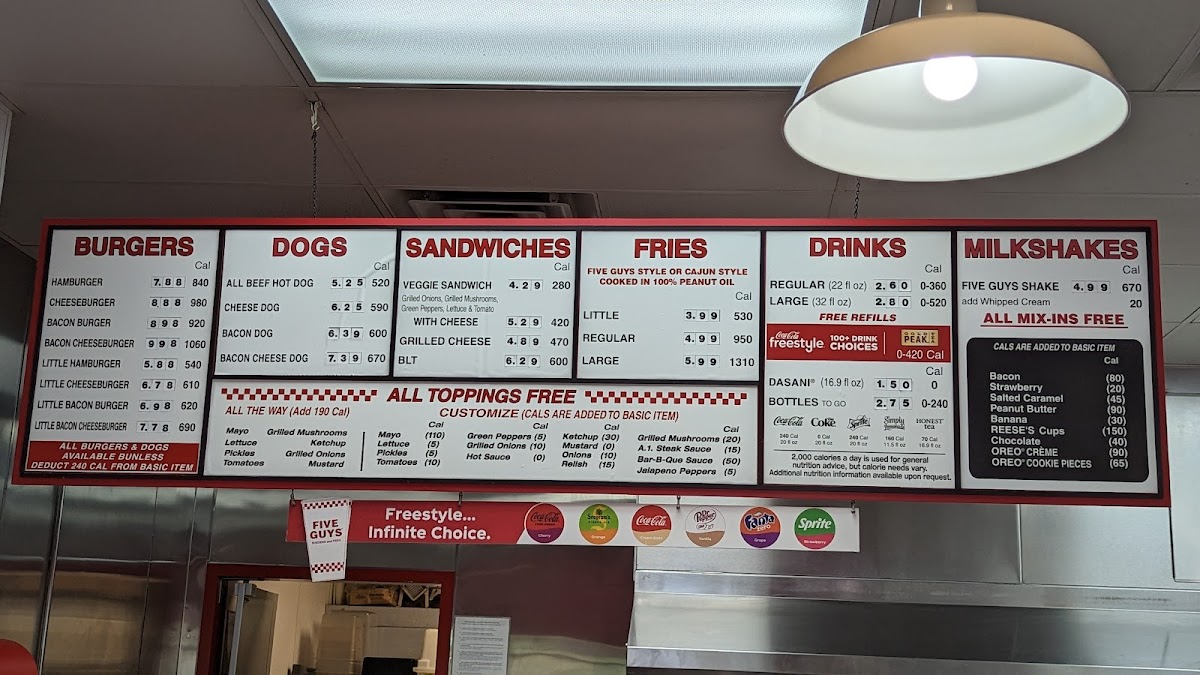 Five Guys stands out as a top-tier fast food and American restaurant specializing in fresh, hand-formed hamburger and hot dog delights. Their main menu features juicy hamburgers, cheeseburgers with melted American cheese, and bacon burgers, all served on a soft, toasted sesame seed bun. What sets Five Guys apart is the freedom to customize your burger with an unlimited array of fresh toppings, letting every bite be uniquely yours.
